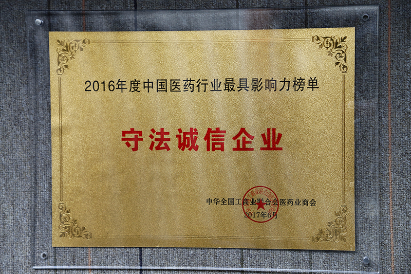 由中華全國工商業(yè)聯(lián)合會醫(yī)藥業(yè)商會舉辦的“2016年度中國醫(yī)藥行業(yè)最具影響力榜單”征評活動于6月20日揭曉,我公司在此次評選活動中榮獲“2016年度中國醫(yī)藥行業(yè)守法誠信企業(yè)”榮譽(yù)稱號。