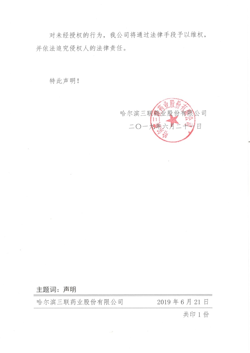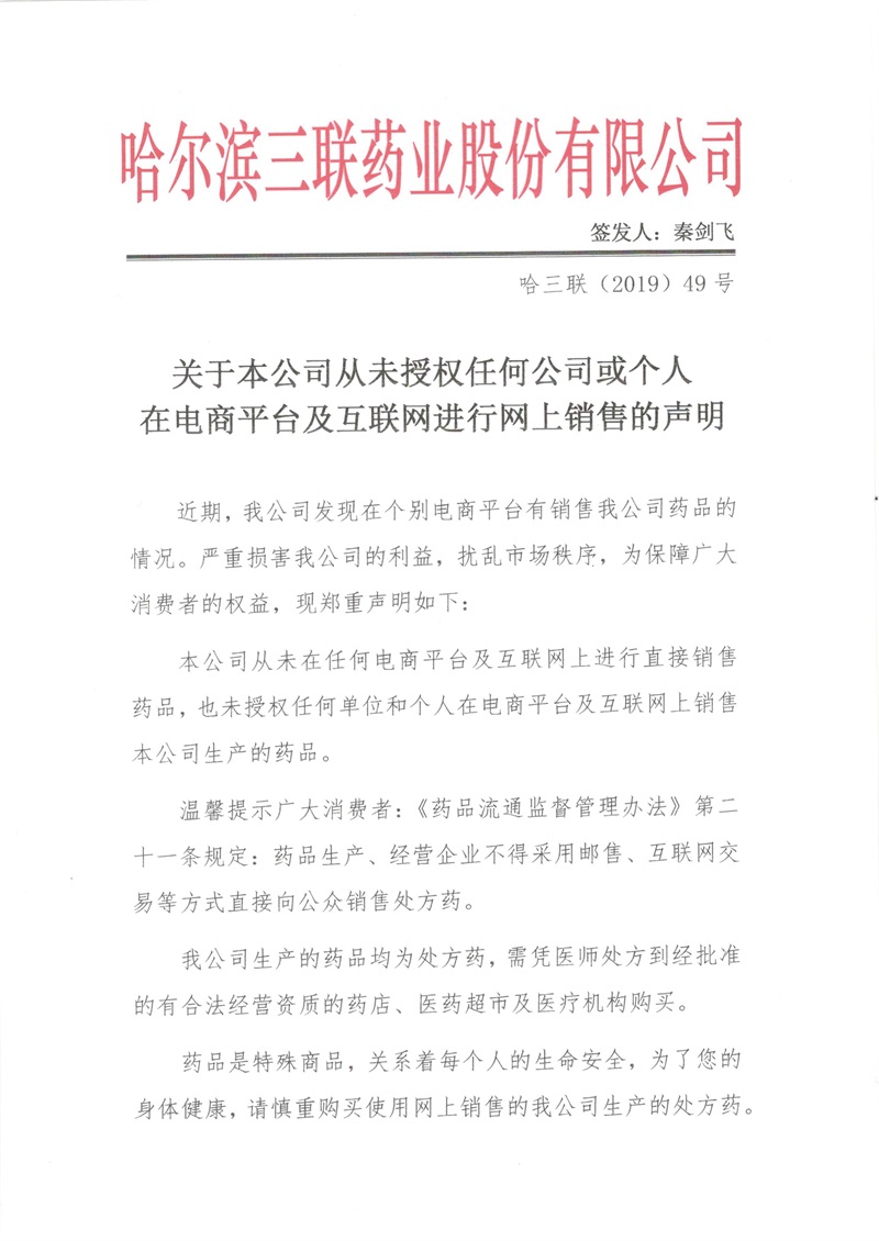 近期,我公司發(fā)現(xiàn)在個別電商平臺有銷售我公司藥品的情況。嚴重損害我公司的利益,擾亂市場秩序,為保障廣大消費者的權(quán)益,現(xiàn)鄭重聲明: