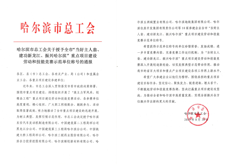 哈爾濱市總工會關于授予全市“當好主人翁、建功新龍江、振興哈爾濱”重點項目建設勞動和技能競賽示范單位稱號的通報: