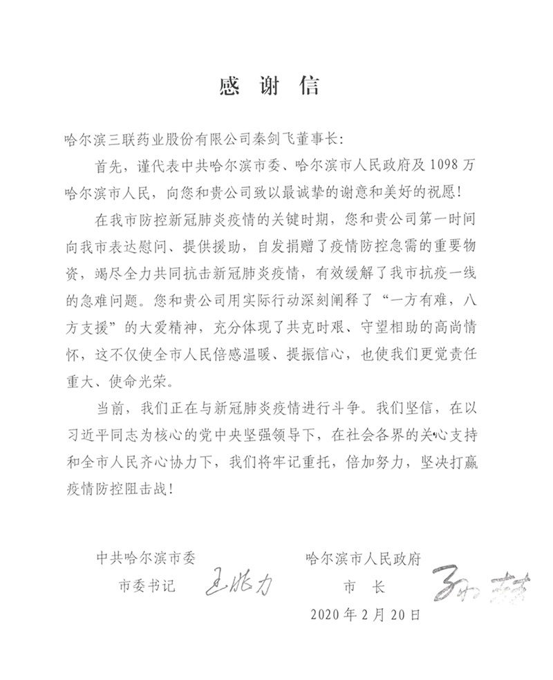 一方有難,八方支援,在舉國上下共同抗擊疫情時期,哈三聯(lián)時刻關(guān)注疫情發(fā)展以及抗疫一線的物資需求,積極籌措物資馳援一線,希望能為抗擊疫情盡一份綿薄之力。今天,就在中國傳統(tǒng)節(jié)日“二月二,龍?zhí)ь^”的前一天,我們有幸收到了一封來自哈爾濱市委書記王兆力、市長孫喆的感謝信:
