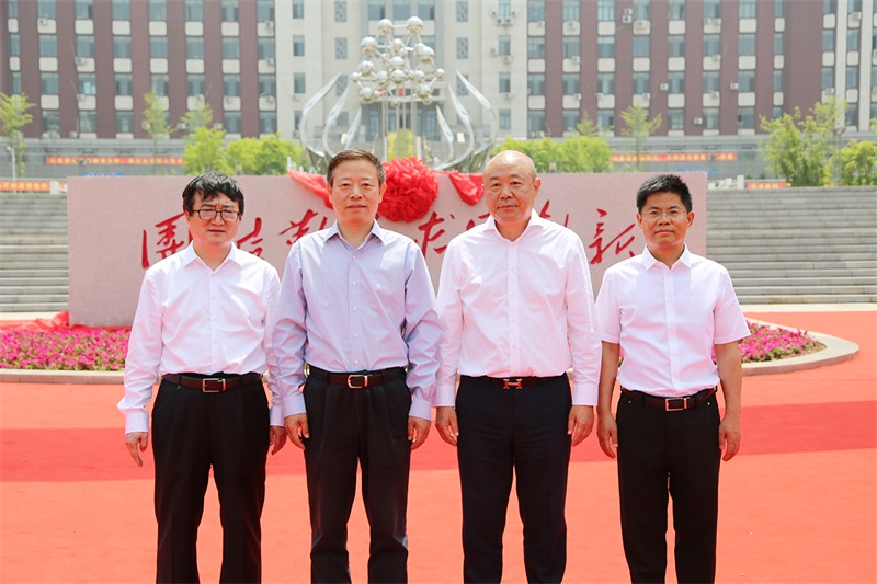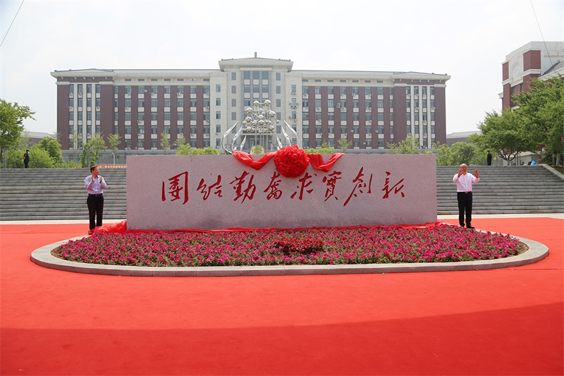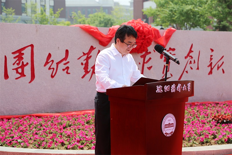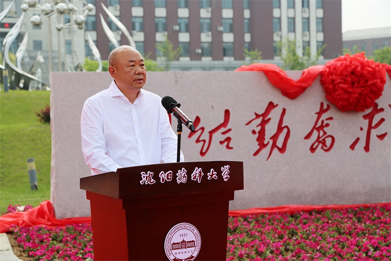 沈陽(yáng)藥科大學(xué)校黨委書(shū)記徐鳳翔、哈三聯(lián)董事長(zhǎng)兼總經(jīng)理秦劍飛為校訓(xùn)石揭幕