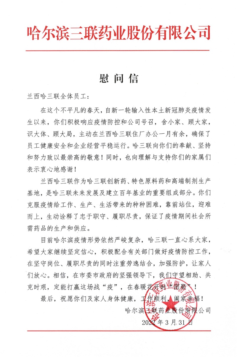 當(dāng)前全國新冠肺炎疫情呈持續(xù)蔓延之勢,哈爾濱市疫情防控連續(xù)“升級”,蘭西哈三聯(lián)員工積極響應(yīng)疫情防控和公司號召,克服疫情給工作、生產(chǎn)、生活帶來的種種困難,舍小家、顧大家,識大體、顧大局,主動住廠辦公一月有余,保證了員工健康安全和企業(yè)經(jīng)營平穩(wěn)運行。哈三聯(lián)一直心系蘭西員工,3月31日,哈三聯(lián)總經(jīng)理秦劍飛先生與有關(guān)部門代表將豬肉、食堂自制的鹵貨、特侖蘇牛奶以及汾酒等3萬余元慰問品裝入物流車,送往蘭西,感謝蘭西哈三聯(lián)全體員工的默默堅守與付出。