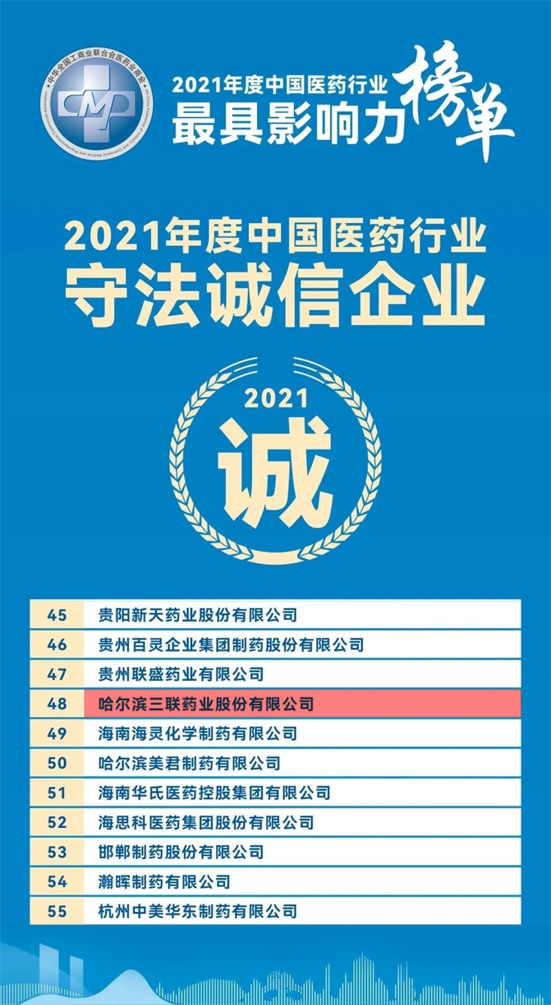 近日,全國(guó)工商聯(lián)醫(yī)藥業(yè)商會(huì)網(wǎng)絡(luò)發(fā)布2021年度中國(guó)醫(yī)藥行業(yè)最具影響力榜單,哈三聯(lián)喜獲年度中國(guó)醫(yī)藥行業(yè)守法誠(chéng)信企業(yè)。