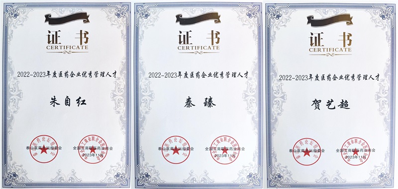 公司董事、質(zhì)量技術(shù)管理中心總監(jiān)朱自紅,總裁助理秦臻,第三事業(yè)部總經(jīng)理賀藝超3人同時(shí)榮獲“2022-2023 年度醫(yī)藥企業(yè)優(yōu)秀管理人才”稱號(hào)。