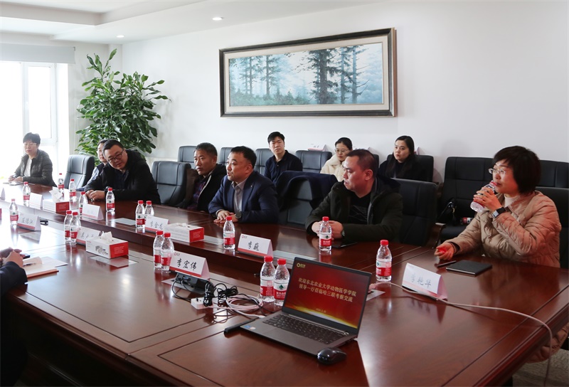 東北農(nóng)業(yè)大學(xué)動物醫(yī)學(xué)學(xué)院動醫(yī)系主任張文龍,動藥系主任、學(xué)科帶頭人李艷華就學(xué)科發(fā)展建設(shè)、產(chǎn)品研發(fā)工藝、深化產(chǎn)教融合等事宜交流有關(guān)看法。