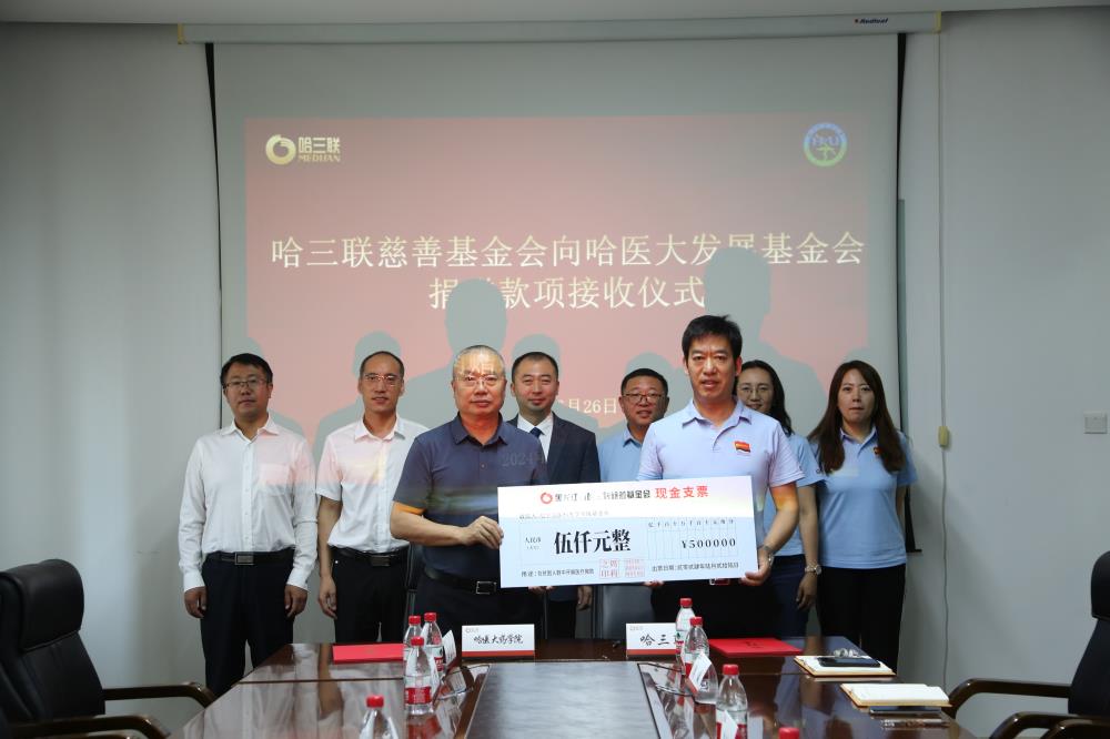 6月26日,哈三聯(lián)與哈爾濱醫(yī)科大學(xué)藥學(xué)院舉行實(shí)踐教學(xué)基地簽約揭牌儀式暨基金會(huì)捐贈(zèng)儀式。哈爾濱醫(yī)科大學(xué)藥學(xué)院黨委書(shū)記孫建平,院長(zhǎng)張勇,副院長(zhǎng)梁海海、謝良軍,團(tuán)委副書(shū)記王琦,藥化聯(lián)合黨支部書(shū)記甘春麗;哈三聯(lián)人力資源中心總監(jiān)吳大勇,黨群工作總監(jiān)、慈善基金會(huì)秘書(shū)長(zhǎng)殷洪玉及相關(guān)部門(mén)負(fù)責(zé)人出席本次儀式。