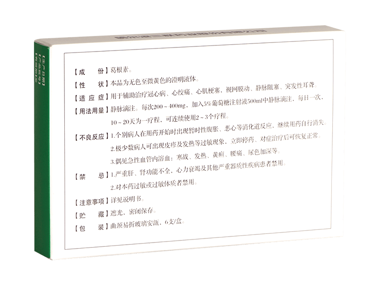 | 適應(yīng)癥 | 用于輔助治療冠心病、心絞痛、心肌梗塞、視網(wǎng)膜動(dòng)、靜脈阻塞、突發(fā)性耳聾 |