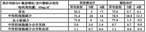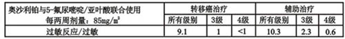 奧沙利鉑與5-氟尿嘧啶/亞葉酸聯(lián)合使用發(fā)生各級(jí)別毒性的患者百分率。
