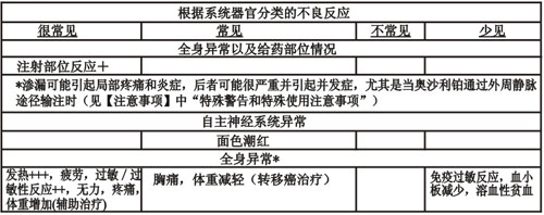 奧沙利鉑與5-氟尿嘧啶/亞葉酸聯(lián)合使用期間,可觀察到的最常見(jiàn)的不良反應(yīng)為:胃腸道(腹瀉,惡心,嘔吐以及黏膜炎)、血液系統(tǒng)(中性粒細(xì)胞減少,血小板減少)以及神經(jīng)系統(tǒng)反應(yīng)(急性,劑量累積性,外周感覺(jué)神經(jīng)病變)??傮w上,這些不良反應(yīng)在奧沙利鉑與5-氟尿嘧啶/亞葉酸聯(lián)合使用時(shí)比單獨(dú)使用5-氟尿嘧啶/亞葉酸時(shí)更常見(jiàn)、更嚴(yán)重。下列表格中顯示的不良反應(yīng)發(fā)生率數(shù)據(jù)來(lái)自國(guó)外轉(zhuǎn)移癌治療和輔助治療所進(jìn)行的臨床研究(奧沙利鉑與5-氟尿嘧啶/亞葉酸聯(lián)合治療組分別包括416和1108例患者),以及來(lái)自上市后經(jīng)驗(yàn)。