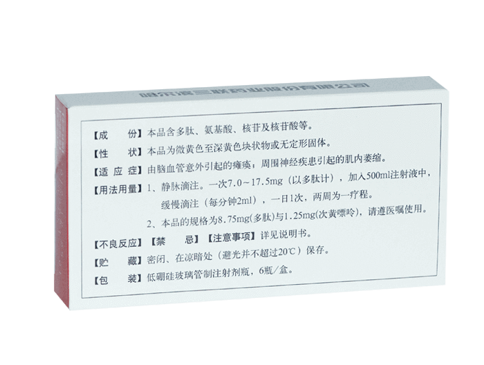 2、本品的規(guī)格為 8.75mg(多肽)與1.25mg(次黃嘌呤),請(qǐng)遵醫(yī)囑使用。