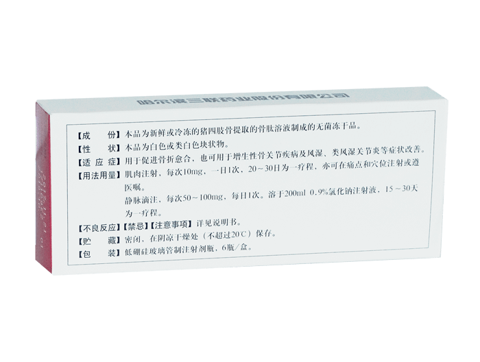 | 適應(yīng)癥 | 用于促進(jìn)骨折愈合,也可用于增生性骨關(guān)節(jié)疾病及風(fēng)濕、類風(fēng)濕關(guān)節(jié)炎等癥狀改善 |